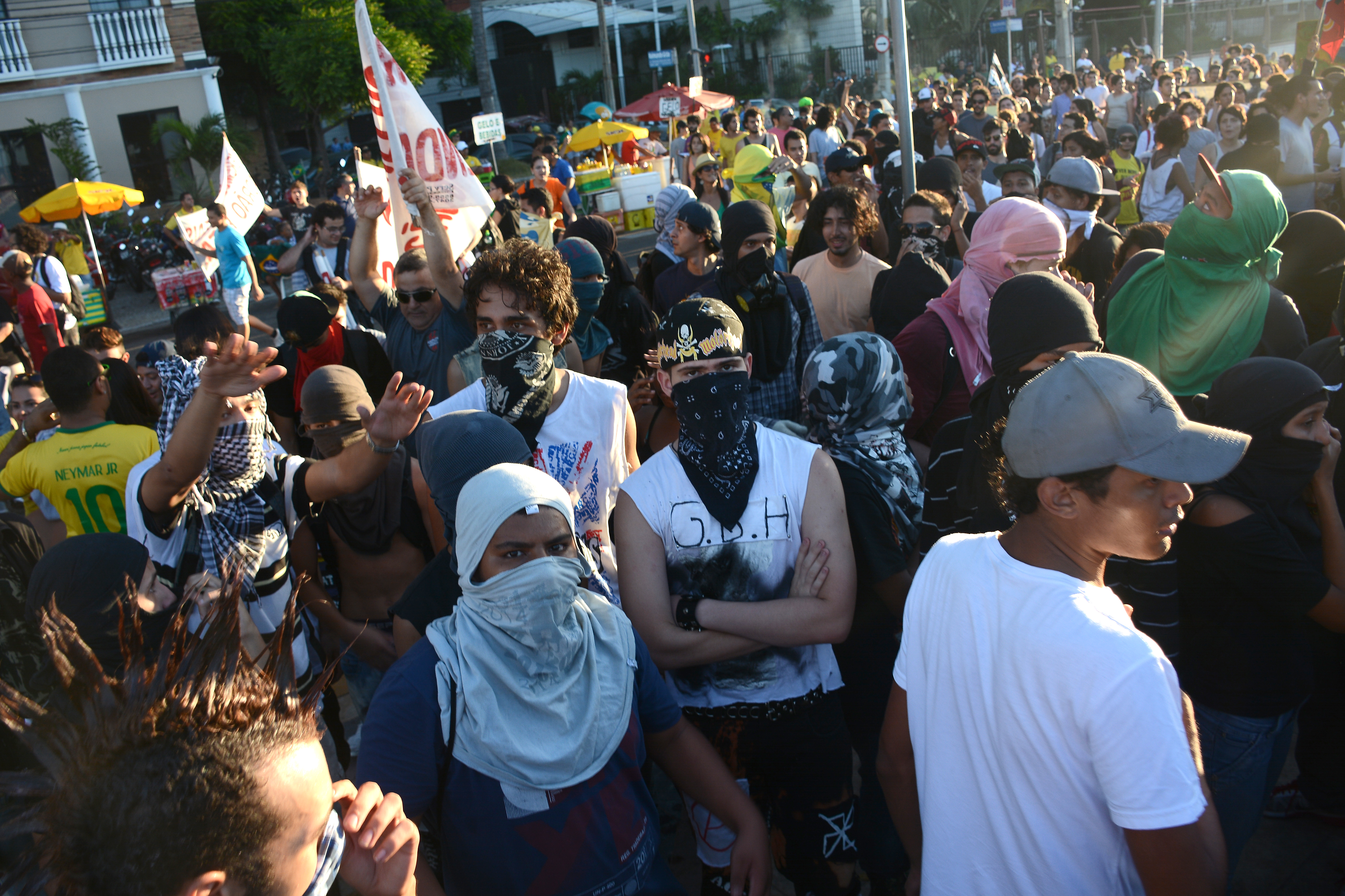 FORTALEZA, CE, BRASIL, 12-06-2014, 15h00: Cerca de 250 manifestantes protestam em frente à estrutura da Fan Fest em Fortaleza. Houve confronto depois que um pequeno grupo de manifestantes atirou pedras em direção à polícia; um adolescente foi detido.